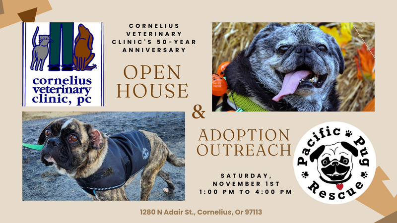 One of the vets at Cornelius Vet Clinic adopted a wonderful pug mix named Benny from us and they are inviting us to their open house. We will be there with adoptable dogs for you to meet.